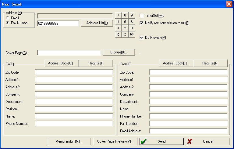 3、 在彈出的傳真發(fā)送對話框中,輸入目的傳真號碼,然后單擊“Send”
