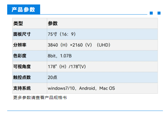 質感全黑外觀、視覺零貼設計、高精度紅外觸控、前置多功能端口、定制揚聲器方案、 三種系統方案可選,多樣化的產品硬件拓展(超高清攝像頭/數字麥/投屏器等)
