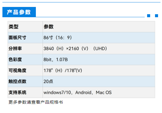 質(zhì)感全黑外觀、視覺零貼設計、高精度紅外觸控、前置多功能端口、定制揚聲器方案、 三種系統(tǒng)方案可選,多樣化的產(chǎn)品硬件拓展(超高清攝像頭/數(shù)字麥/投屏器等)